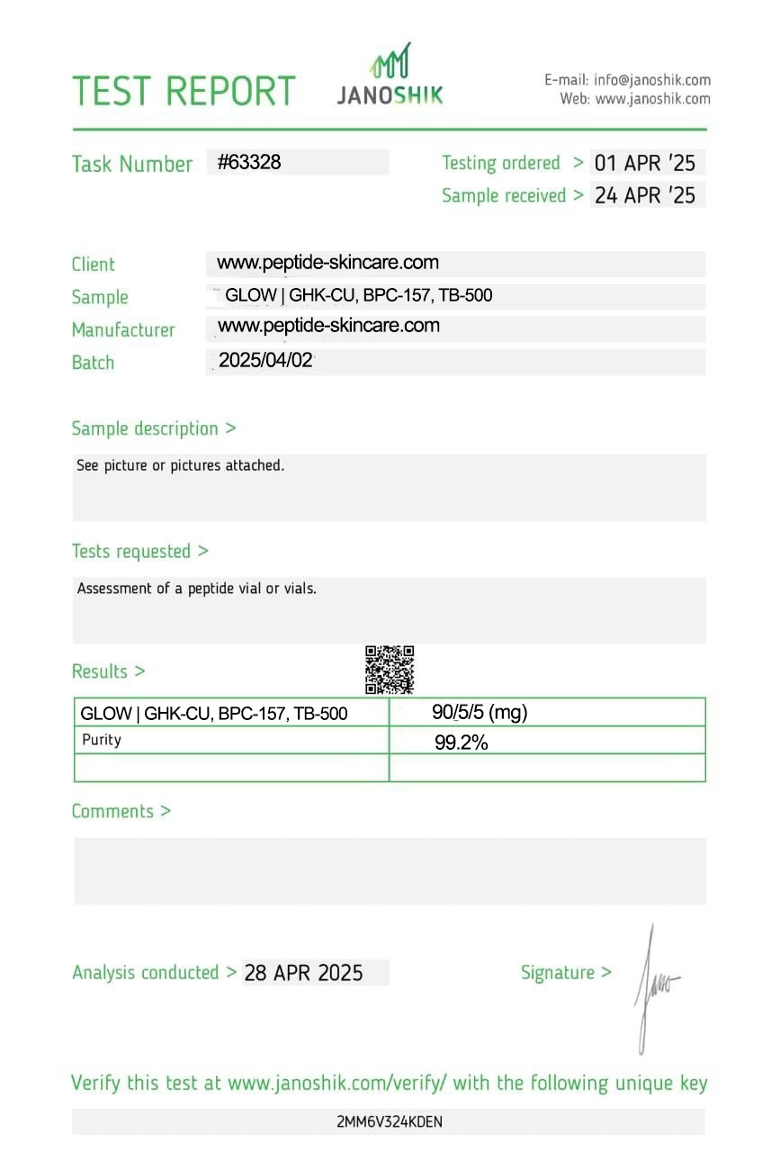 he GLOW Peptide Complex is a synergistic formulation of three regenerative peptides designed to support skin healing, tissue repair, and cosmetic rejuvenation. Combining BPC-157 for cellular recovery, TB-500 for anti-inflammatory and repair acceleration, and GHK-Cu for collagen synthesis and pigmentation balance, GLOW is ideal for research into topical wound care, anti-aging regimens, and post-procedural healing.